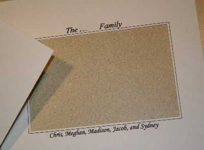 Mina de utilizando un paquete de procesamiento de textos simple. Primero dibujé un cuadrado (he hecho una tabla con una columna y una fila, con un borde) y luego inserta el apellido familiar por encima de la caja y los nombres de cada miembro de la familia abajo. Imprimí el documento centrado en la página y tuve espacio para cortar alrededor del exterior. Luego corté por la ventana un poco la inserción de la caja impresa para dar profundidad extra un poco.