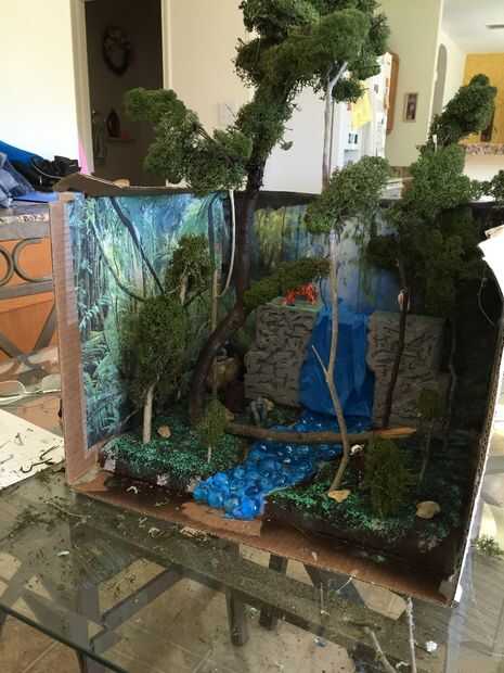 Mi tercer grado hijo llegó a casa y me dijo que tenía que hacer un proyecto para la escuela. Él decidió crear un diorama de una selva tropical. Anteriormente hicimos el error en un proyecto previo de utilizar mi impresora 3D para ayudar a las partes. Su clase entera sabe que tenemos uno y es "esperado" para usarlo, al menos por sus compañeros de clase. Así que le dije a diseñar y crear lo que él quería que la escena sea y utilizaríamos alguna impresión 3D para ayudar a que enfríe.