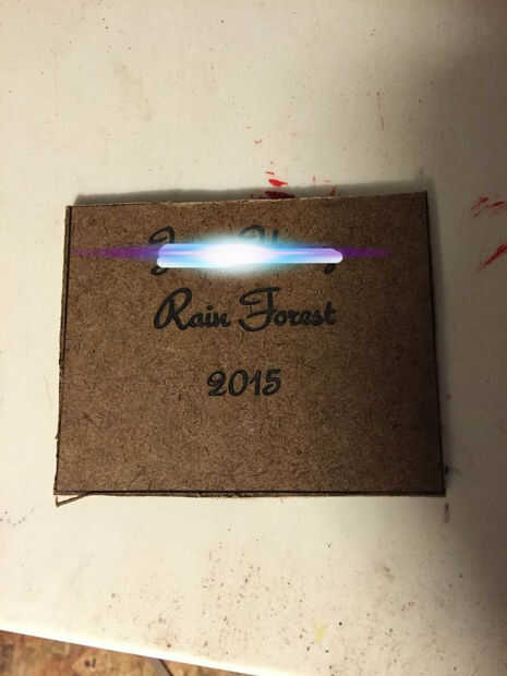 Mi hijo estaba bastante orgulloso de su creación y estaba orgullosa de él haciendo (o mayor). Así que tomé un viejo pedazo de Junta de 1/8 pulgadas y láser su nombre y el escenario que escogió (selva tropical) y el año. Entonces él clued en la parte posterior de la caja de envase.