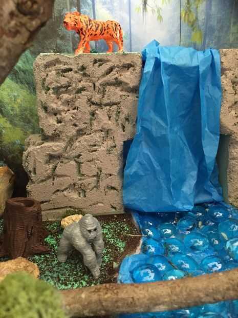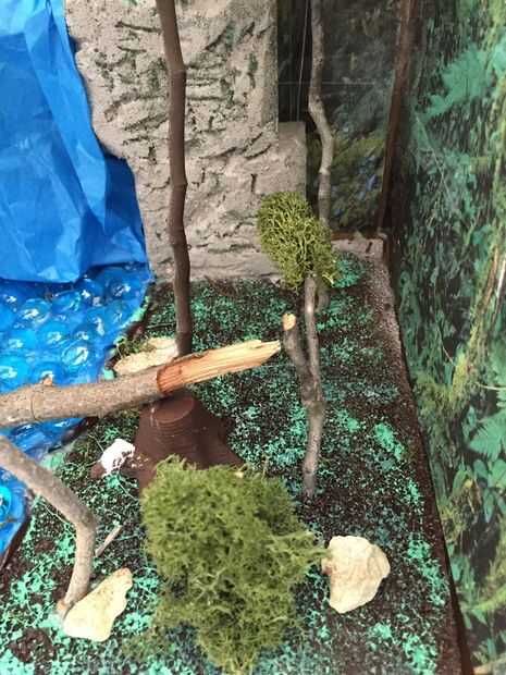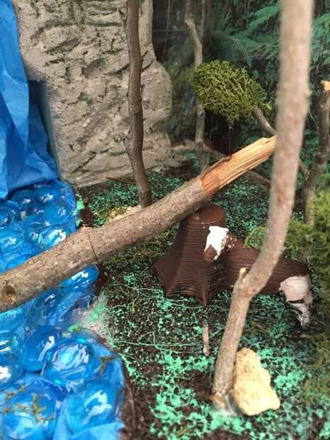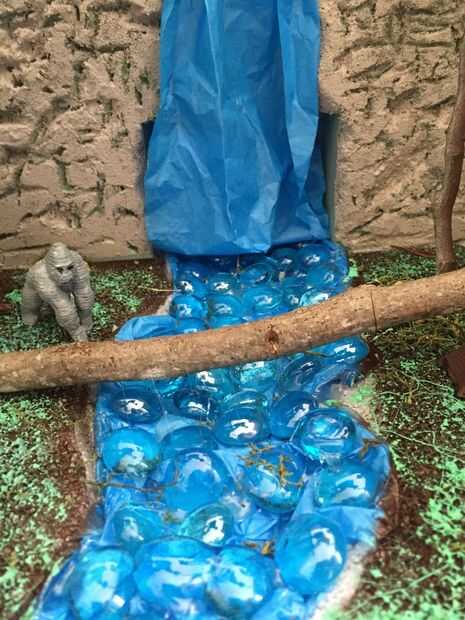 Mi hijo labrado formaciones rocosas dentro de las cuatro secciones de espuma que apilados juntos y separados, con dos a cada lado. Hemos pintado la espuma de un color gris rocoso con cierta textura. Obligó a un palito entre las dos secciones de roca de espuma y simplemente caliente clued poco azul tejido de papel poner sobre el palo. Dio la impresión de caída de agua. He querido poner un LED azul detrás de él para encender para arriba, pero mi hijo vetó esa idea. Se utilizó un hierro caliente para cortar un canal en la base de espuma. Colocó papel de tejido y piedras color azul baratas te calientes que compramos en la tienda de dólar. Dio la impresión interesante de agua rápida.