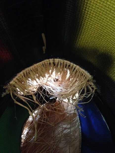 quería disfrazar un poco los agujeros del brazo y fije la falda de la hierba directamente sobre el traje. Compré un 24' tabla hierba que bordea, desde que supe que iba a utilizar todo el traje. Mucho más barato que comprar varias faldas. Me quedé por difundir una cantidad generosa de pegamento dentro del traje por encima de los brazos, luego pegué 2 capas de la falda de la hierba encima de cada agujero del brazo. Luego hice lo mismo a la parte inferior de la Tiki, pero fui a 3 capas en esta parte.