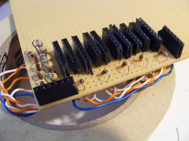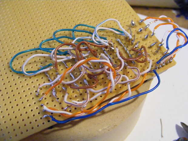 Tomé algunos ethernet CAT5 de par trenzado sin blindaje cable aparte para usar como mi cables de puente a puente las conexiones por debajo de mi perfboard. En los diodos y resistencias de la soldadura donde sea necesario. No estoy orientada hacer cualquier circuito personalizado grabado así que voy a correr con mi perfboard.