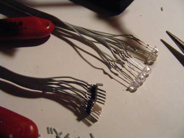 Ahora hacer lo mismo con el cable de cinta para soldar los LEDs a los arneses de cable. Guesstimate cuánto tiempo desea que los cables o se refieren a una maqueta de su camisa en que manera enrutamiento los cables.