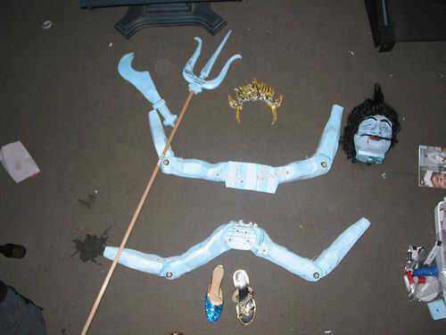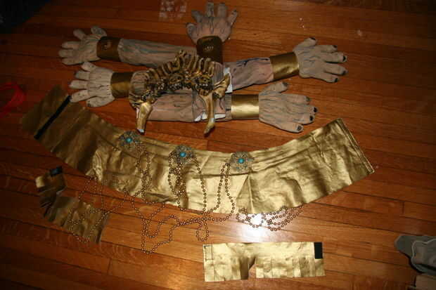 He cortado a la tela en tiras y había cosido en las mangas. Metió los guantes de bateo de algodón y mano los había cosido a las mangas. Cubrí la costura de la muñeca con un brazalete de oro vinilo. He pintado muerto - estilo venas y contusiones y uñas en los guantes.