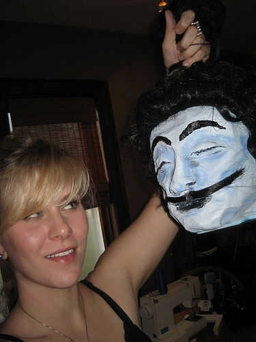 He modificado una peluca "salmonete" imitado su peinado con la cola de caballo en las cejas arriba, añadidas y el bigote. Yo utiliza espuma en aerosol en la base del cuello, con un pequeño trozo de espiga de madera para el hueso, para hacer las entrañas sangrientas.