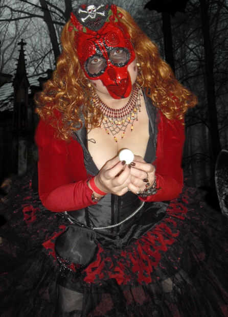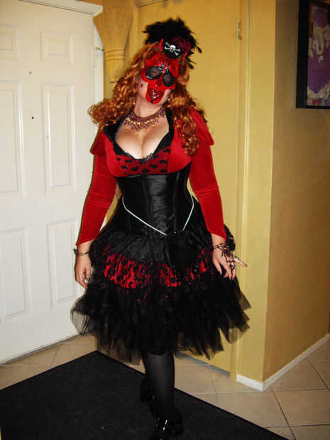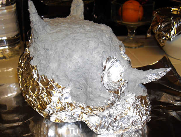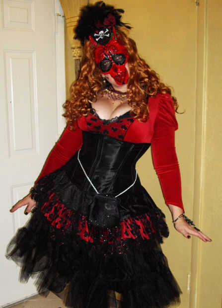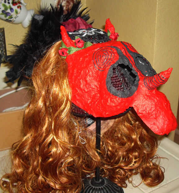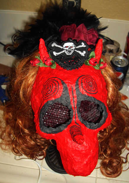 Ni siquiera pensó en hacer un instructable, pero tuvo un par de fotos mientras me estaba haciendo. Usé un cráneo bastante genérico de la espuma de poliestireno como mi molde y había cubierto de papel de aluminio. He añadido cuernos y una nariz larga en el cráneo con pedazos de papel de aluminio que moldeado en las formas quería y luego pegar con cinta adhesiva. Luego mezclé pasta de maché de papel de Celluclay. Hice la mezcla Family liquidez con agua y pegamento de Elmer. Aplica una fina capa, dejar secar durante 24 horas y aplicar otro, etc etc.. Hice esto aproximadamente una semana, hasta que estuve satisfecho que estaba completamente seco, resistente al desgaste, y no de molde (he escuchado Celluclay puede moldear si no bastante seca). Luego trabajé la forma del cráneo, que era menos esfuerzo de lo que pensaba que iba a ser, realmente. Con básico acrílico Apple Barrel, jadeó el interior de la máscara negra y cubre la parte exterior de la máscara en rojo carmesí de la pintura... dos gruesos abrigos durante dos días. Yo no estaba seguro exactamente qué detalles quería pintar en la máscara, por lo que terminé haciendo otras cosas a él primero. Os adjunto una peluca en la parte superior de la máscara con aguja e hilo de rosca, luego pegamento caliente (sólo para estar seguro no saldría con todos el baile que planea hacer con él). Tenía un sombrero tipo triángulo pequeño con plumas en él que nunca había utilizado para nada, así que pintó a la tela de seda en él el mismo rojo como la máscara y esta había cosido en la máscara de peluca. Coser el parche de calavera pirata en, caliente pegado algunos granos negros en el sombrero, cosido un par de rosas rojas en el sombrero y luego usé negro pintura para los detalles decorativos. Que pintar el símbolo del caos en el frente de la máscara, luego dio la máscara de dos capas de barniz de Exterior/Interior del lustre de Delta Ceramcoat y voila! El interior de la máscara era áspero (como el exterior... Me gustó la textura de la Celluclay y así que no intente arena suave) y terminé pegando un pequeño trozo de fieltro negro para el interior de la nariz para que no presione dolorosamente en mi piel. Me caliente había pegado algunas falsas pestañas a los lados exteriores de los ojos de th emask y luego algunos pintura negra sobre el pegamento como toque final.
