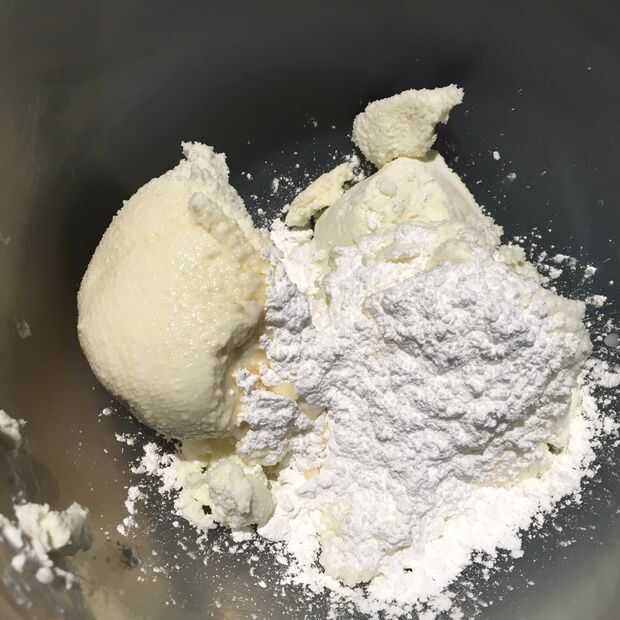 Una vez que se drena el ricotta, transferir a un tazón de fuente o tu soporte mezcla (todo lo que tenemos es la batidora de mano) y añadir el queso de cabra y mezcla durante 1-2 minutos. Añadir el amaretto y parte del azúcar y continúe batiendo. Parar después de un minuto o tan y gusto, añadir más azúcar o amaretto si es necesario y luego mezcle otra vez. Batir hasta que la mezcla esté esponjosa y suave.