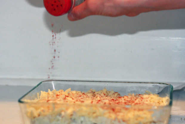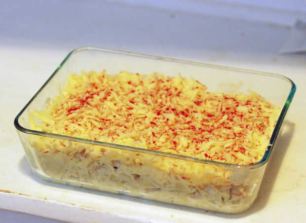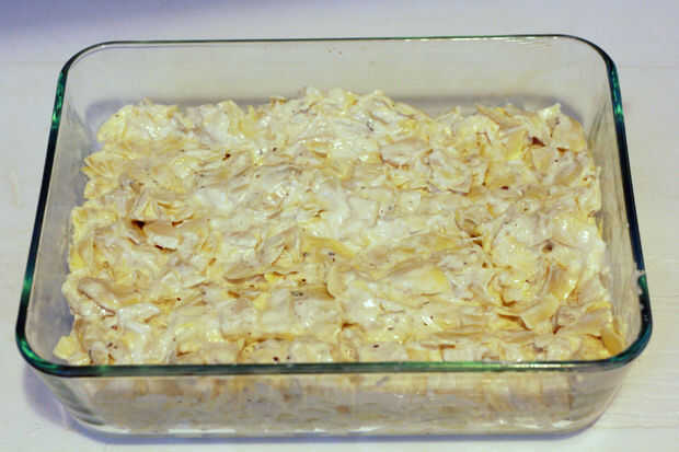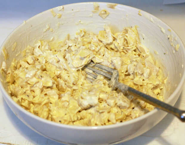 Triturar juntos queso parmesano, queso Boursin, mayonesa y crema agria con un tenedor.