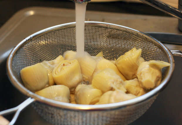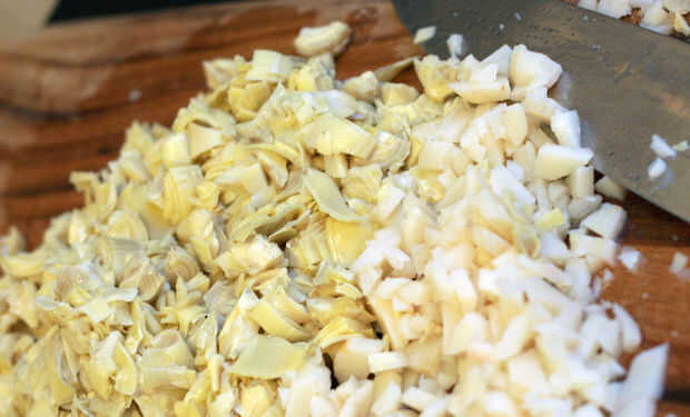 Añadir corazones de alcachofas picados y castañas de agua a la mezcla de queso.