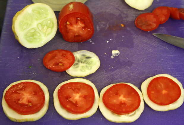 Rodajas de pepinos y tomates y arreglar como se muestra a continuación.  Rodajas de tomate deben ser ligeramente más pequeños que las rebanadas de pepino de base.