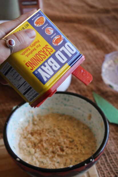 Después de la inmersión es del procesador de alimentos y en un recipiente (tazón de fuente o plástico, uno para la nevera) espolvorear una capa de la vieja bahía en la parte superior de la Dip. Ahí lo tienen gente!