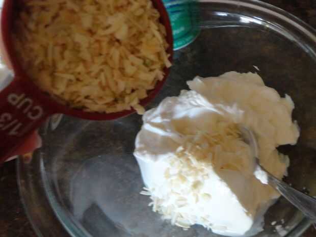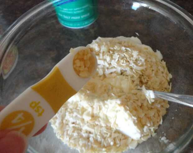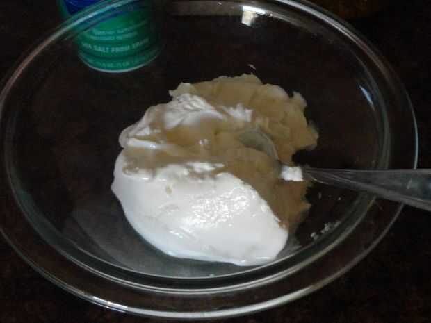 En un bol pequeño agregar: Crema de 8 oz 1/3 taza seco o fresco en cubitos cebolla 1 cucharadita sal de mar sal de curso 1/4 de cucharadita ajo fresco 1 cucharaditas de aceite de oliva