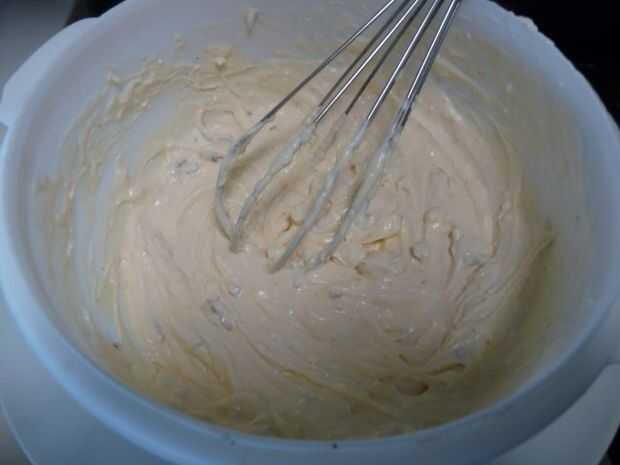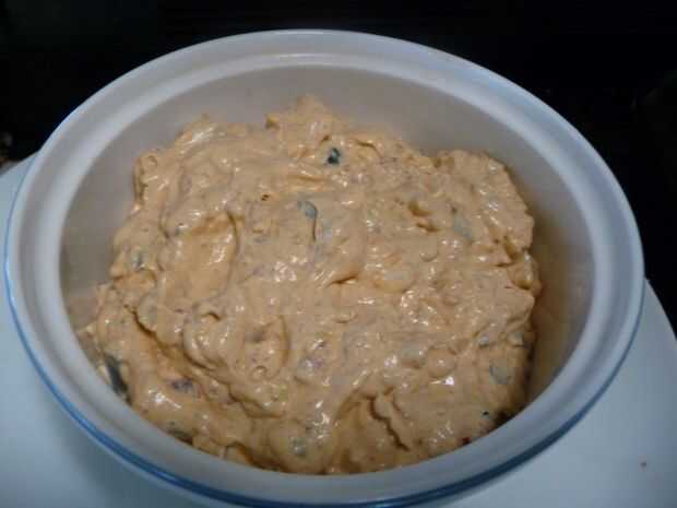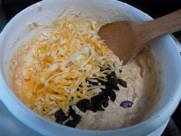 Incorpore el chorizo refrigerado, 1 y 1/4 taza rallado de queso, 1/2 taza de aceitunas y 1/2 taza cebollas verdes cortadas en rodajas. Mezcle todo bien.