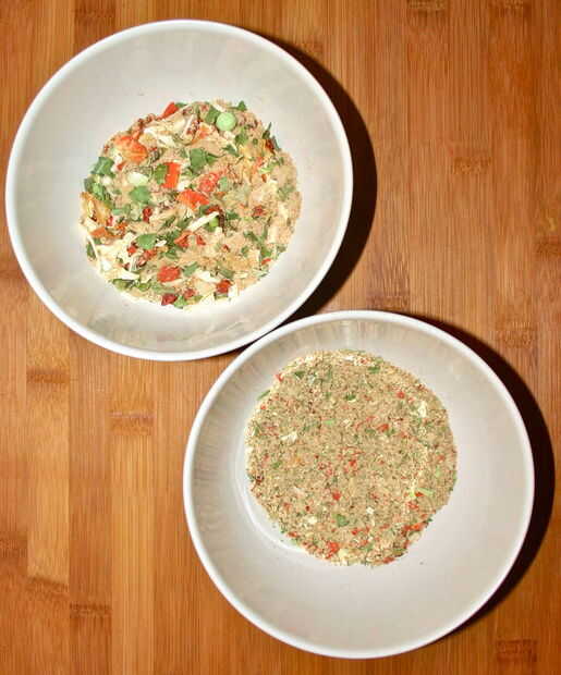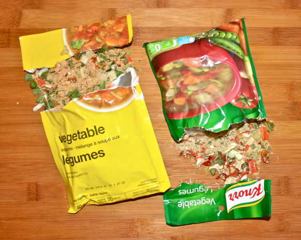 Tomar dos paquetes de cualquier marca de vegetal seco sopa mezcla y aplastar hasta que todos los fragmentos de vegetales secos se han convertido en mucho más pequeños (aproximadamente 1/3 - 1/4 de su tamaño original.)