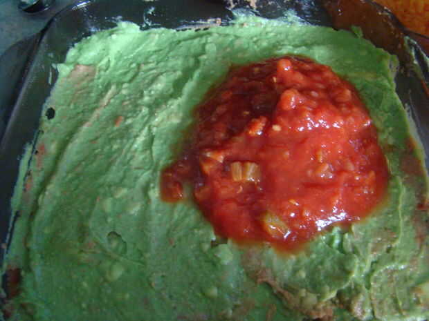 y difundir como la segunda capa.  Esparcir la salsa sobre los aguacates, como la 3 ª capa.