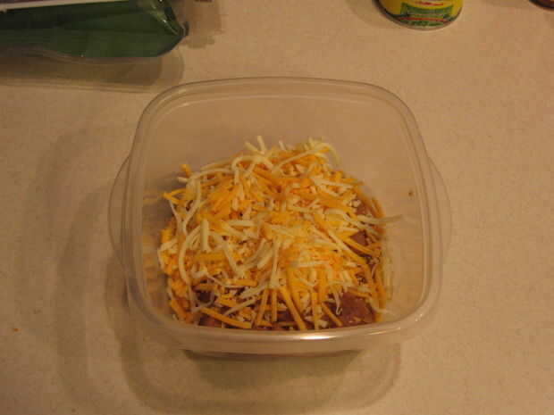 Abrir la lata de frijoles y vacía en un recipiente apto para microondas. Añadir como mucho queso como te gusta - un puñado es suficiente para mí, puede que desee agregar más o menos dependiendo de cómo fuertemente condimentado su queso. Mezclar y microondas, revolviendo de vez en cuando para asegurarse de que el queso se derrite y los granos se calientan uniformemente. Cuando el queso se derrita sobre todo, continuar al paso siguiente.