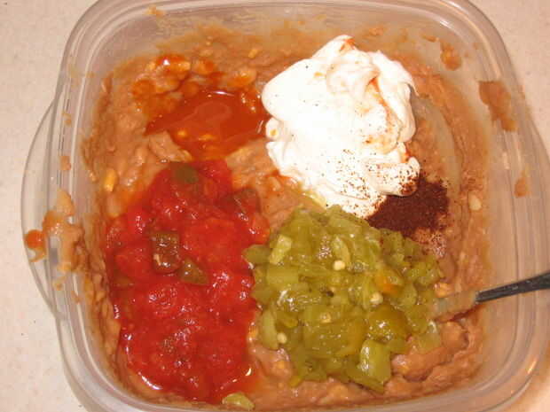 Añadir la crema agria, salsa, chiles verdes, pimienta de cayena y salsa picante a los frijoles calientes. Revuelva hasta que se mezcle.
