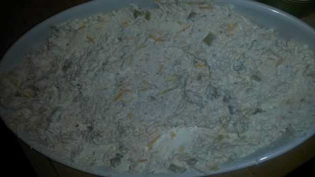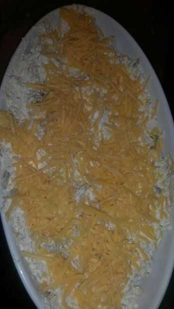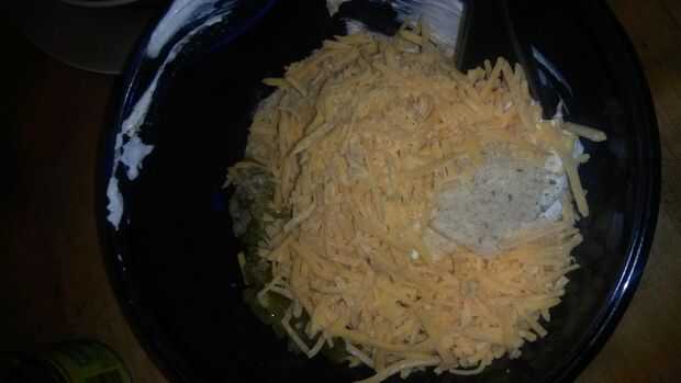 2. mezclar todos los ingredientes. (apartar suficiente queso para cubrir la parte superior del baño.)