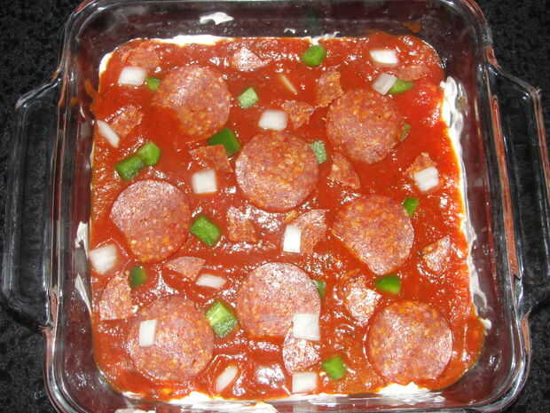 sólo 6 ingredientes!! Este es un dip de pizza caliente excelente perfecto para cualquier ocasión!Paso 1: ingredientes Ingredients:1. italiano pan2. crema (envase de 8oz)3. italiano aderezo mezcla/condimento (1 sobre)4. requesón (envase de 8oz)5. Pepp