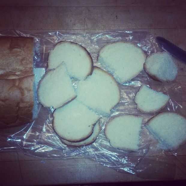 Mientras está horneando el dip corté el pan en trozos pequeños sobre una pulgada y media.