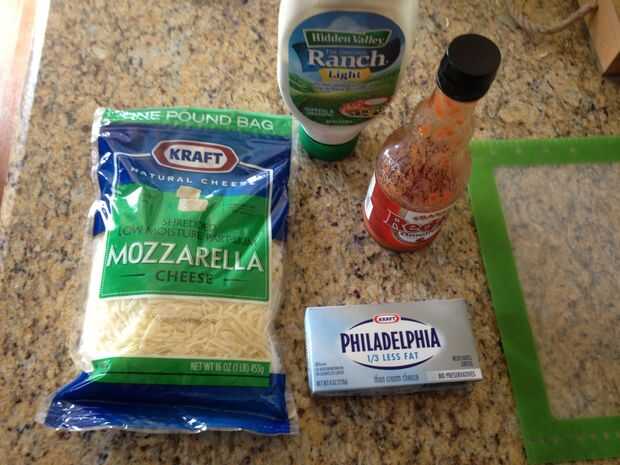 1 paquete de 8oz de crema de queso 1/2 taza francos rojo caliente (o cualquier salsa picante de su elección) 1/2 aderezo ranch 1/2 taza de mozzarella sobre una libra de pollo