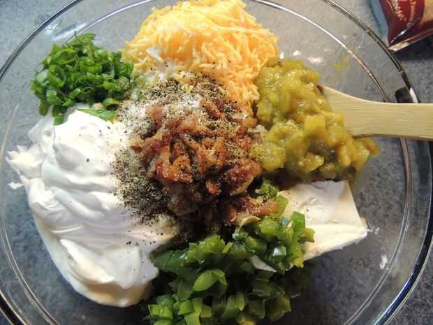 En un tazón grande, combine 1/4 taza de cebolletas, 1 1/2 taza de queso, mezcla de tocino menos 1/4 taza de aderezo, jalapeños menos guarnición y todos los otros ingredientes. Vierta la mezcla en un 9 en redonda de hornear.