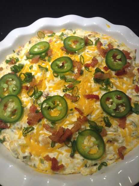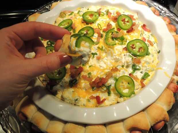 Cueza al horno la inmersión durante 20 minutos en un horno precalentado de 400˚F. Cubrir con tocino reservado, restante cebolletas, en rodajas 1/4 taza queso y jalapeños. Sirva con un cerdo en una manta y tortilla!
