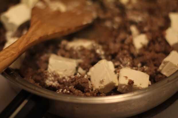 Después de la salchicha se cocina hecha, tienes que hacer carne de cerdo que se cocina bien, es el momento de mezclar con el queso crema. Desmenuzar la salchicha cocida a la consistencia deseada y cubo encima de la crema de queso. Esto hará más fácil para que el sólido se descomponen en su licuado para más fácil. Entonces sólo caer en y seguir revolviendo lo. Aquí está una pequeña nota, para este plato no escurra la grasa de la salchicha. Mantiene las cosas peguen a la bandeja y todas las marcas que he probado, no hay suficiente grasa para que sea vale la pena. Tan sólo asegúrese de mantener agitación y todo estará bien.