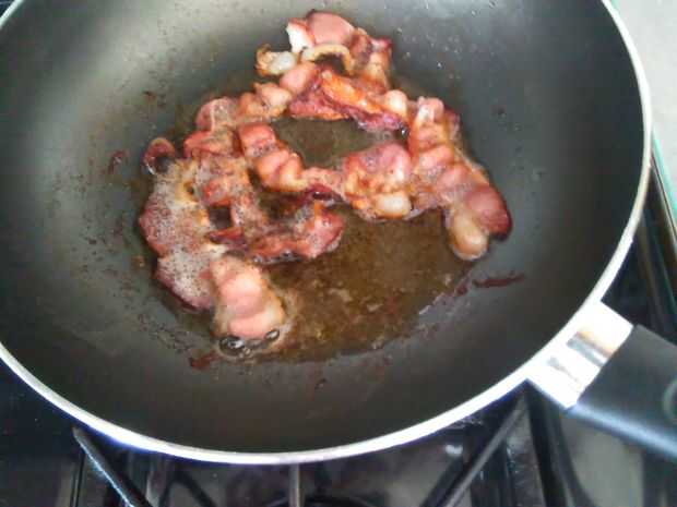 2. Lugar 6 tiras de tocino en un sartén y cocine hasta que esté ligeramente rosado.