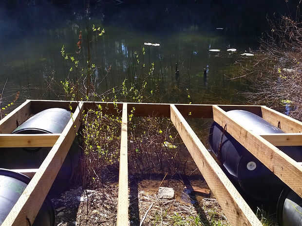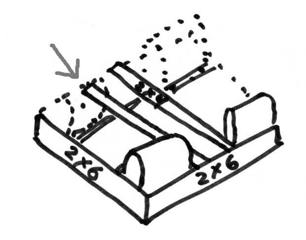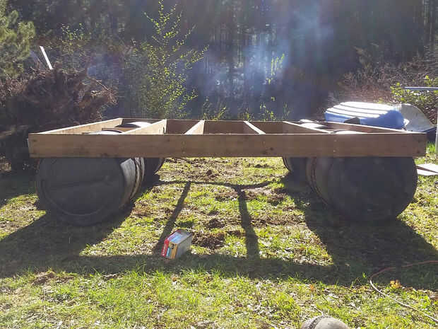 Realmente corto algunos cedro 2 x 4 en este momento para agregar algunos refuerzos adicionales a los barriles. Pero a la vista trasera me di cuenta que eran los cortes únicos que hice para el proyecto y hubiera sido mejor utilizar solamente sin cortar 2 x 4 va todo el camino a través de la parte inferior de la cubierta como se muestra en el dibujo blanco y negro. Mi método aquí funcionaba bien pero añadiendo tableros todo hubiera dado mejor cruce refuerzo y esto habría sido verdaderamente un proyecto de herramienta de una potencia. Utilizamos muchos materiales reciclados así que a veces que tenemos para nuestro uso.