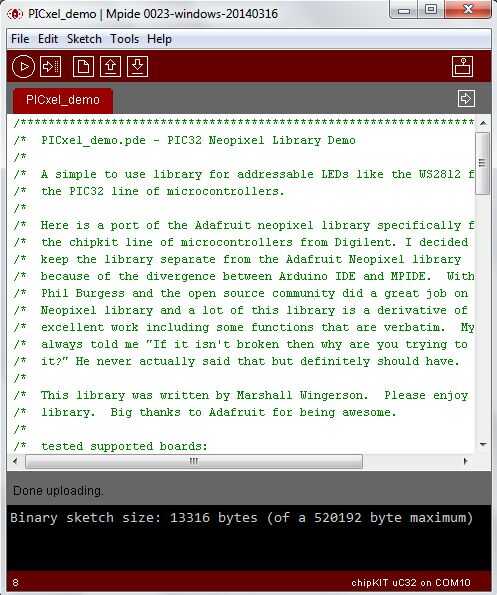 5. Si "Done uploading" se muestra en la barra gris entonces el chipKIT ha programado con éxito