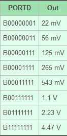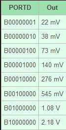 generador, pero para generar la onda suave que necesitamos estables de tensión analógica. Patrón común para resolver este problema es tomar unas salidas digitales y conectarlos juntos por divisor de tensión - se puede ver en los esquemas en la esquina inferior derecha. Estamos usando la salida digital del Arduino D0-D7 porque se gestionan por solo registrarse (puerto D). Esto significa que podemos cambiar el valor de los 8 bits (D0-D7) con la sola asignación, por ejemplo: PODTD = B10000001 establecería D0 y D7 a 1. Esto también significa que la correlación entre el valor de byte y salida analógica es lineal. Imágenes adjuntas contienen ejemplos que he medido con osciloscopio: