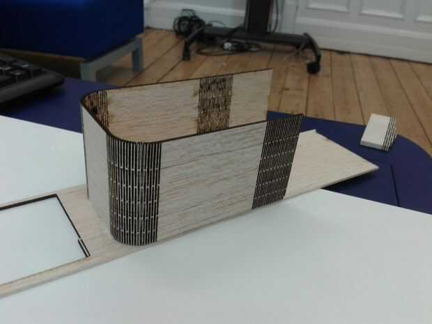 Decidí doblar la tira de madera de balsa a un arco. Puede hacerlo tomando un tazón de fuente redondo grande de agua recién hervida y lentamente doblando la tira en su interior. Si poner encima un objeto pesado como una taza y dejar durante 1-2 horas en el agua la balsa debe doblarse muy bien. una vez plegado, sáquelo y deje que se seque (lo siento que no tengo ninguna foto del que, probablemente era demasiado perezoso para tomar algo). Cortar dos medios círculos en la madera de balsa para los lados.