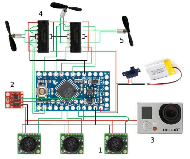 La GoPro (3) es ideal para la inicialización de fotos remotamente y finalmente los Puentes de H (L293D) para los motores + accesorios (4). Potencia de puente H líneas deben conectarse directamente a la batería, no va sobre el arduino ya los motores producen mucho ruido! Esto puede inutilizar las lecturas de los sensores. Pero no olvide conectar a tierra de los puentes H para arduino aunque. Además, los puentes de H deben conectarse a PMW pines para que funcione correctamente.