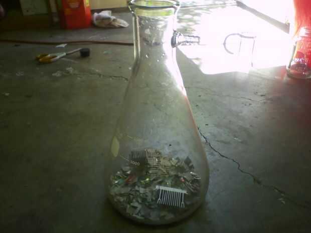 Como configurar su reacción en los dos cuadros: Añadir el aluminio primero, luego el agua. En este punto, coloque el tubo de goma a la salida y cuando esté listo, añadir la lejía. Espere unos diez segundos ver cuántas burbujas forma--si el nivel del agua sube demasiado, a derramar un poco en su cuenca. Una vez que tienes el nivel adecuado, limpie el interior del cuello del recipiente con un trapo para quitar la humedad (de lo contrario su enchufe se deslizará hacia fuera) y luego conectarlo con un tapón de caucho. Utilice cinta adhesiva si es necesario.