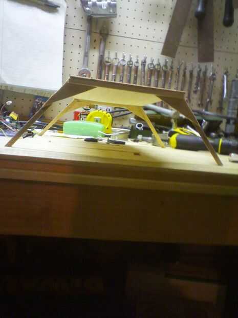 Ahora necesitas las piernas de su dirigible. Tenía el lander de la luna de Apolo en mente cuando hice mío y créeme valen--protegen su equipo precioso de daño del impacto y la balsa es para que la luz que el peso es prácticamente insignificante. Mina son 6" de largo, en un ángulo de unos 45 grados debajo del horizontal. Corte / limar los extremos de cada pata para que cuando los 'pies' en el suelo, la pierna es a 45 grados, y el ' superior ' es paralela a la horizontal. Ahora pega cada pata en su lugar para que se peguen hacia fuera a los lados, con los pies más o menos planos (te vas a pegar bolas de algodón, así que no necesita ser perfecto).