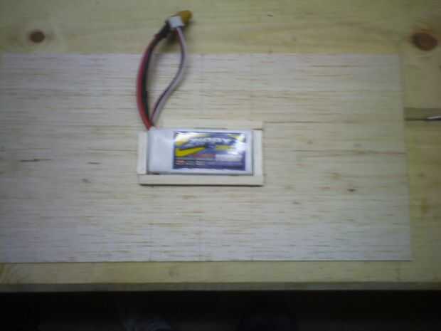 Una cosa más a añadir en este paso: la caja de batería. La batería es el componente más pesado, por lo que para ser exactamente centrada. Medir las dimensiones de la batería, y luego utilizarlos a medida de los lados y esbozar un cuadro en el centro. Asegúrese de que la batería quede antes de que pegue la balsa y deje un pequeño espacio para los cables empujar hacia fuera.