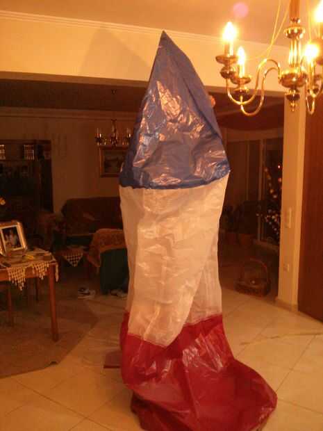 Después de nuestra nariz, empezamos a pegamento que el cuerpo principal. El centro de este hemiciclo va a ser el pico de nuestro cohete, por lo que la circunferencia del hemiciclo se une a la circunferencia del cilindro.