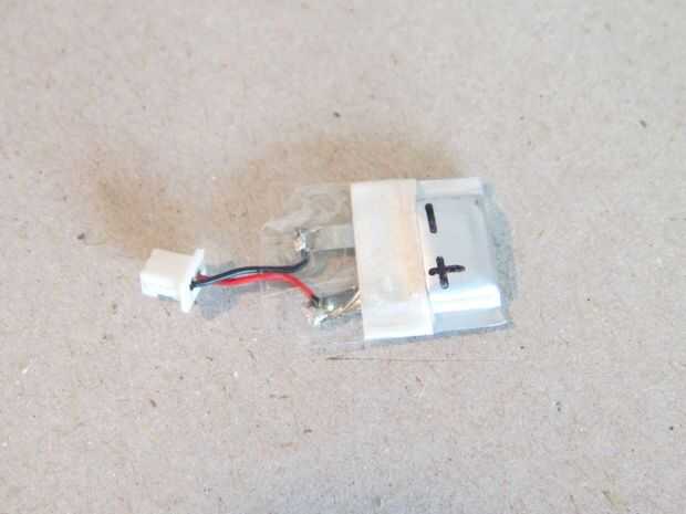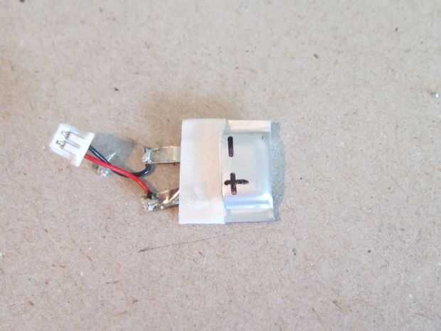 He añadido algunos corta cables con conectores de batería de echada de 1.25 Molex hembra. Este conector se usa comúnmente en las baterías para los aviadores micro minio Kyosho, lámina y Vapor, pero usé una versión extra ligera como de a.o. Ciencias de éter. Utilicé un soldador de precisión fina de alambre de soldadura y trabajado rápida y decisivamente para no sobrecalentar la batería. Pongo soldadura a la mitad las tiras de la batería. También había estañado previamente los extremos pelados del cable antes de soldar en. Luego corté de los extremos de las tiras sobrantes, teniendo cuidado de no cortocircuito la batería tocando ambas bandas al mismo tiempo con las pinzas. Finalmente cubrí las tiras desnudas con alguna cinta, cubriendo también parte de los cables y la batería para fortalecer un poco el conjunto.