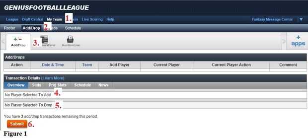 Conforme avanza la temporada, probablemente observará que algunos de sus jugadores son estrías muy poco, que no en todos, o pueden ser lesionados. Cuando esto sucede, considere la adición de un "agente libre". Un agente libre es un jugador que no fue seleccionado en el proyecto inicial y no es propiedad de nadie en su liga. Si hay un agente libre realizar mucho mejor que alguien de tu equipo cada semana, considerar el cambiar a los jugadores. Para lograr esto, siga los pasos que se muestra en la figura 1. En el paso 4, escriba el nombre del agente libre que desee agregar y escriba el nombre del jugador que desea caer en el paso 5. Asegúrese de enviar la transacción una vez completado.