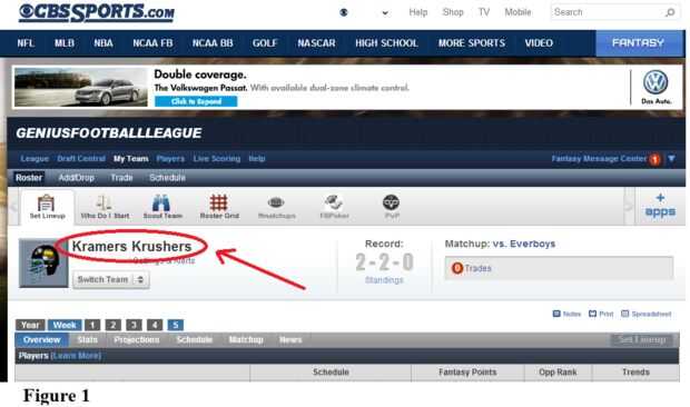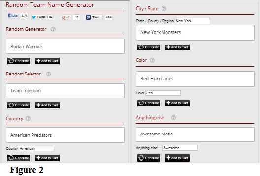 El ejemplo «Kramers Krushers"se muestra en la figura 1 utiliza el primer y el tercer elementos mencionados. Además, hay varios recursos en la web dedicada exclusivamente a nombrar equipos de fantasía. La figura 2 muestra un nombre de herramienta de generador disponible en "www.teamnames.net." Esto puede ser útil si la creatividad no viene fácilmente a usted. Si tenga en cuenta todos esos puntos, el nombre del equipo será más creativo en tu Liga!