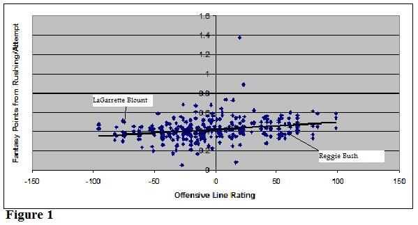 -Encontrar líneas ofensivas los equipos deben hacer bien. La fuerza de un delito es determinada por la fuerza de su línea ofensiva. Esto es especialmente cierto para los runningbacks. Como se muestra en la figura 1, existe una correlación positiva entre la producción de un runningback y su calificación de línea ofensiva.