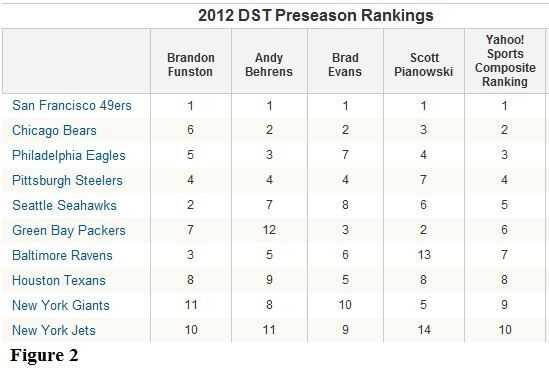-Determinar los equipos con los mejores equipos de defensa especiales. Buenas defensas pasan menos tiempo en el campo, que da la ofensa más tiempo para anotar. La figura 2 muestra el Top de 2012 diez equipos de defensa especiales.