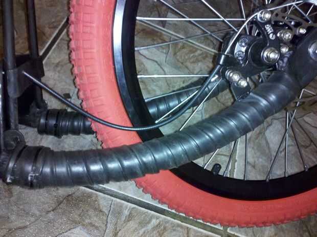 ya he utilizado en mis motos por lo que era un obvio y justo corro a la tienda de bicicletas, pidieron unos cuantos soplados hacia fuera y enrollada en el chasis, atado con lazos zip y estaba listo para ir... parecía demasiado kinf de fresco! un poco ratrod! (amo el estilo tengo un camión y un cochecito de dunne que hice tanto este estilo... bien otros ibles)
