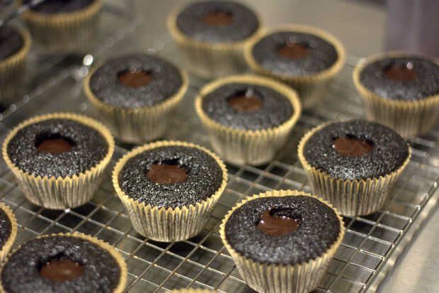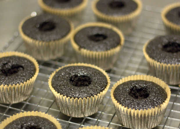 Ahora que han todos han quitado el corazón, es tiempo para rellenar con el ganache de chocolate de menta. Si usas una botella del apretón, sólo apriete lejos y llenar cada cupcake. Si no tienes una botella del apretón, use una cuchara y con cuidado Vierta el ganache en cada cupcake. Que tenga que volver y agregar la ganache un poco a cada Magdalena, tiende a establecerse.