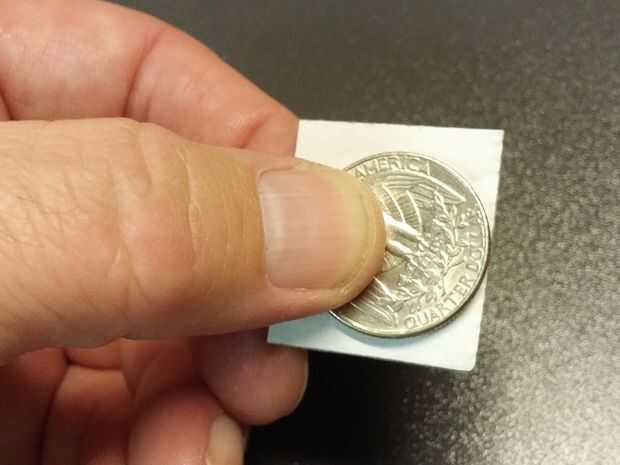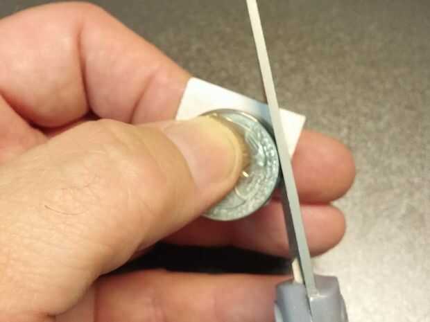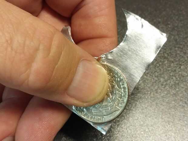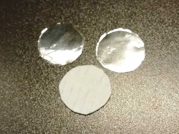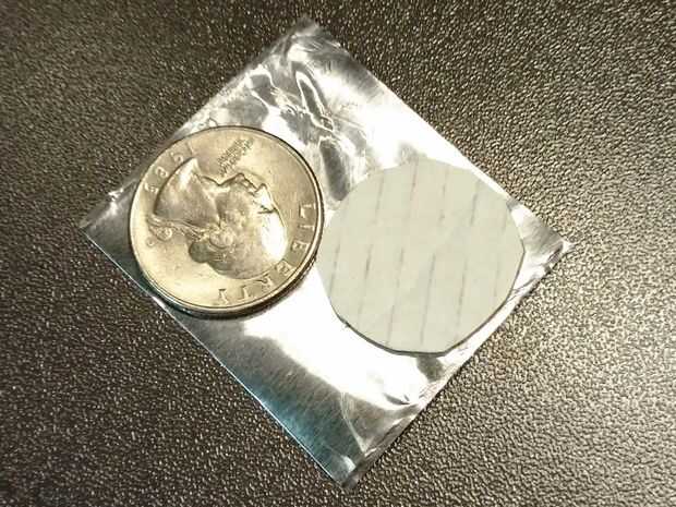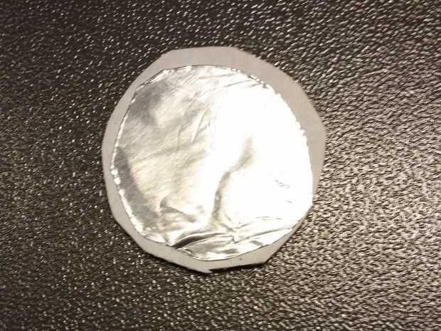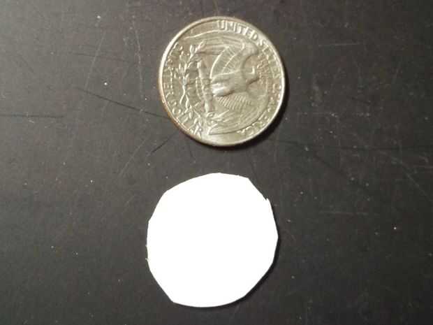 Me pareció más fácil de cortar un trozo de cartón y cinta hasta una plaza sólo lo suficientemente grande como para el trimestre que caben y con el barrio y el material, recortar. La cinta metálica, corte un poco poco más de él que era ligeramente más pequeño que el disco de cartón. No quería la oportunidad los bordes demasiado cerca y llegando a contactar con los demás.