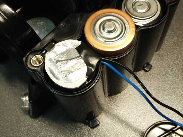 Si el compartimiento de las pilas se cierra como ésta, necesita perforar el conjunto de los cables a. También, la hora de elegir dónde colocar este disco, asegúrese de utilizar uno de los contactos que tiene el resorte en él. Esto permitirá la conexión para adaptarse al grosor del disco.