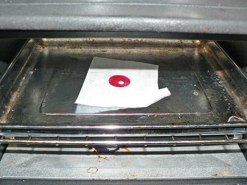 Quitar. Si el disco es no muy plano, mientras está todavía caliente, use un libro sobre una superficie dura para presionar y asegurar que está plana.