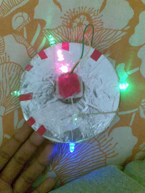Ahora toma un motor y soldar dos cables a los dos terminales del motor. Luego tomar el led y goma de configuración que hiciste en el paso anterior y fijar en la parte giratoria del motor. Ahora fije el lado libre de motorthe de configuración de cd usando la pistola de pegamento. Asegúrese de todo este tiempo todos que sus leds mantener encendida y conexiones no se pierden