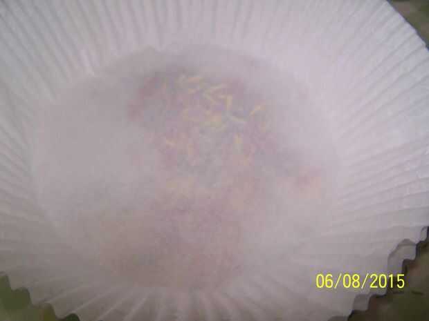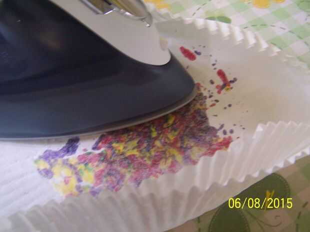 Ahora usando la plancha precalentada, puede empezar a derretir las virutas de lápices de colores. Tenga cuidado al hacer esto como las virutas de derretimiento más rápido de lo esperado, en cuestión de segundos que la pila de virutas de ahora se ha convertido en una masa fundida de crayón
